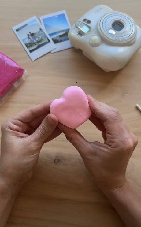 start by shaping the clay into a heart, making sure the bottom is nice and flat so it sits properly, before pressing a slit down the middle to hold the photo.